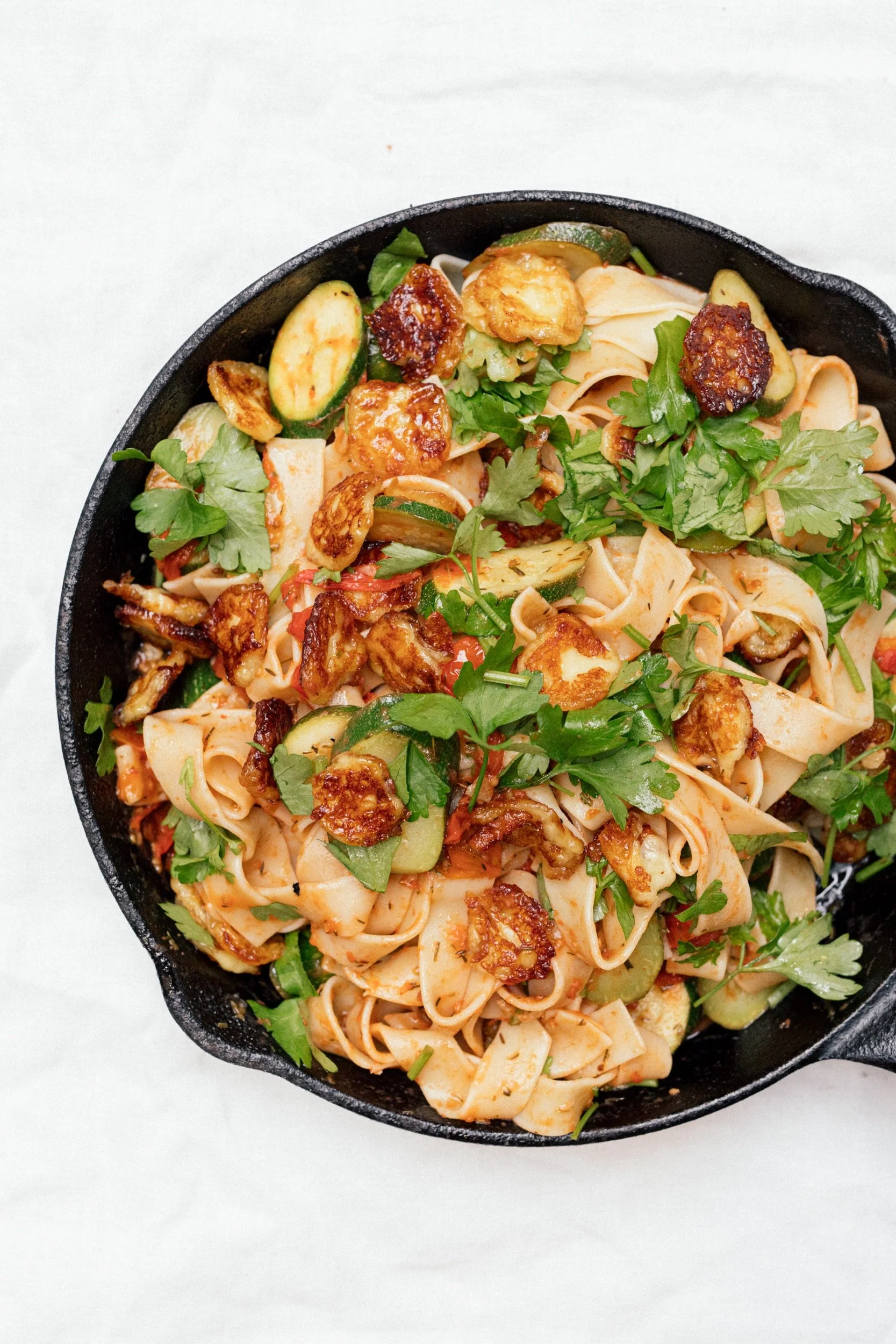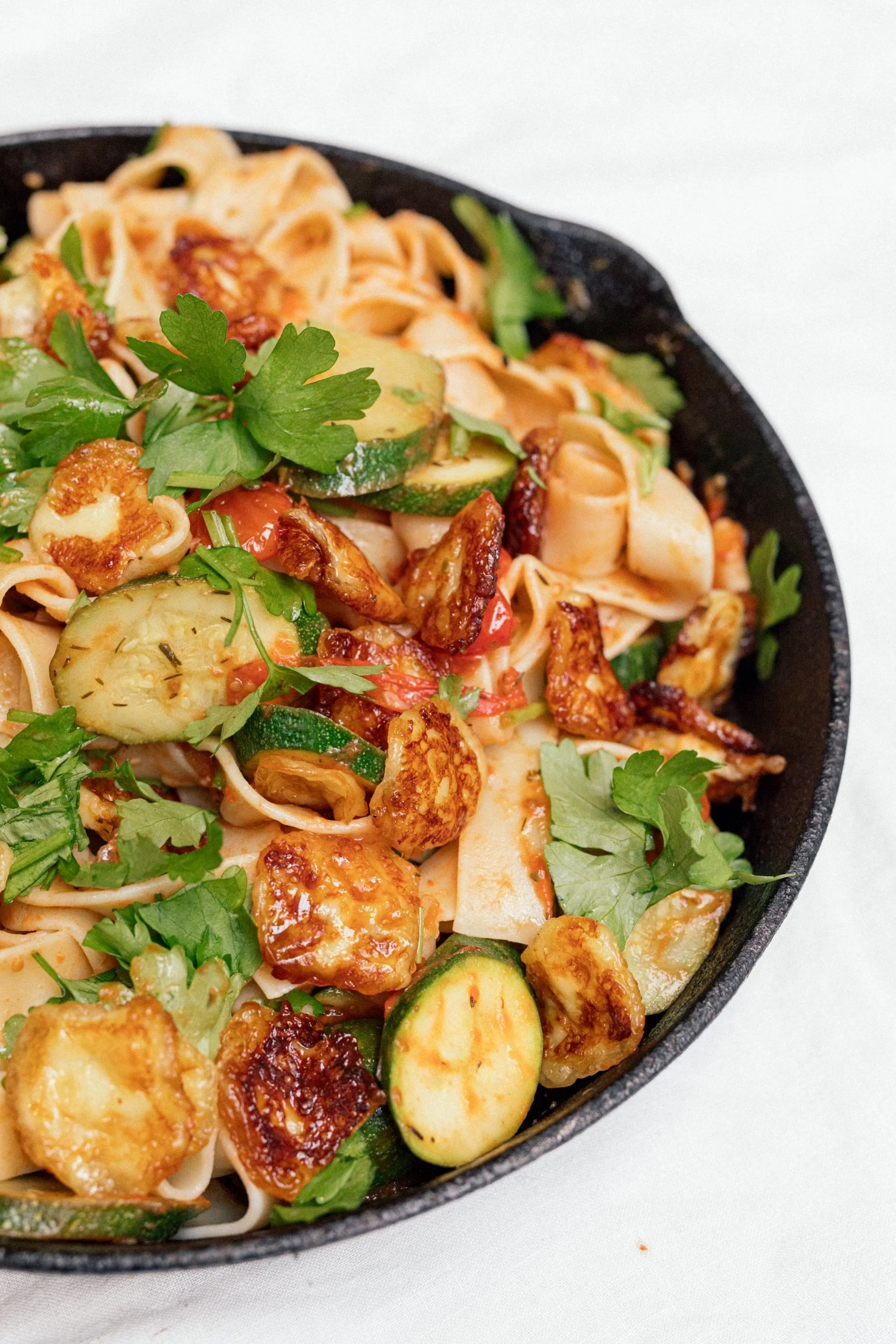 Add the tomatoes and salt. Simmer for 5 minutes. Add the zucchini and leave to simmer for a further 10 minutes while you cook the pasta and fry the halloumi chunks.