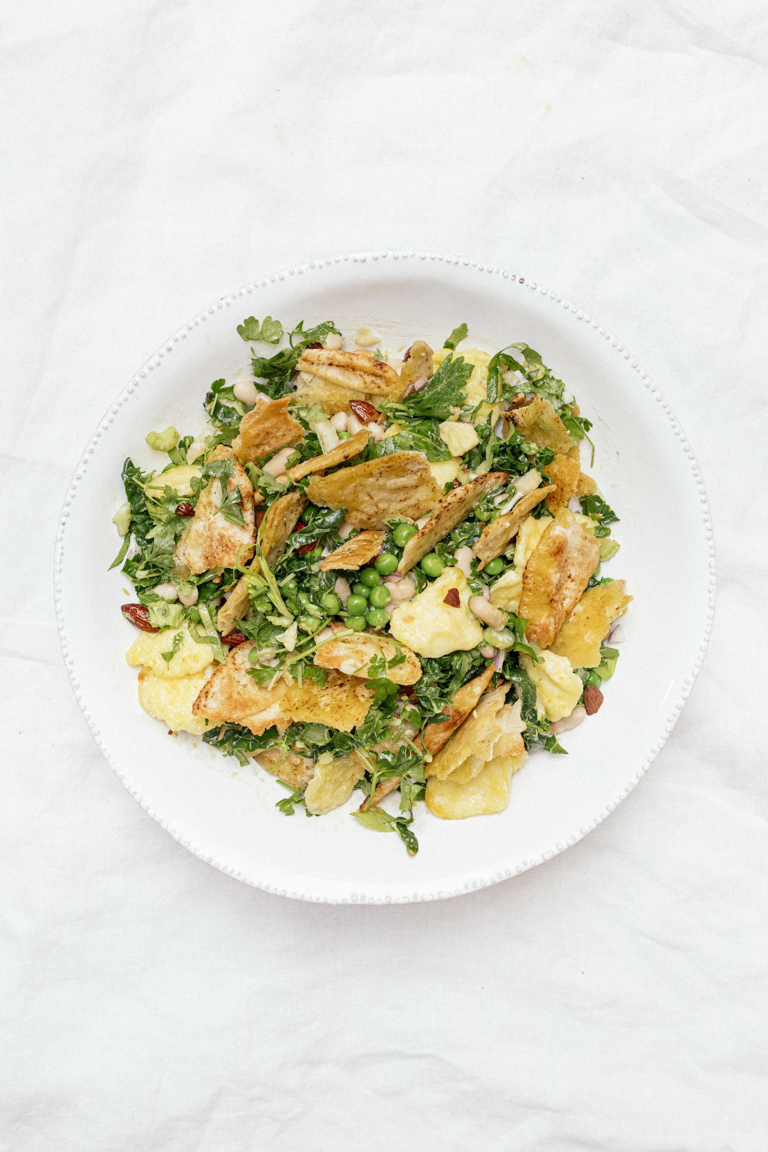 In a bowl, add the butter beans, celery, herbs, almonds, kale or silverbeet, peas and red onion. Toss together.